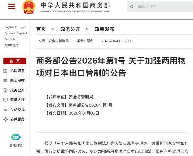 第一道禁令 1月6日,中国商务部发布2026年第1号公告,宣布即日起全面加强两用物项对日本的出口管制。 这一禁令明确禁止所有两用物项向日本军事相关用户、军事用途出口,同时禁止一切可能助力日本提升军事相关能力的其他用户和用途。